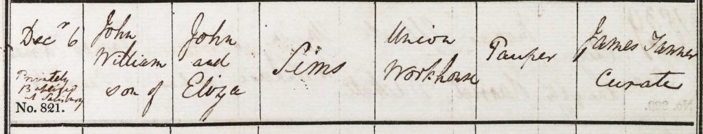 On the 3rd of October 1836, Eliza married a man named John Sims. They married in the presence of a man named John Rolfe and Eliza’s sister, Maria. Eliza and John Sims had their first and only child together in 1838 named John Sims. His baptism was registered in Kingsclere, however there is a note to say he was privately baptised in Salisbury. It also notes that his father was a pauper living in a Union Workhouse. John Sims senior passed away very soon after his son’s birth. He died at the workhouse in Salisbury.