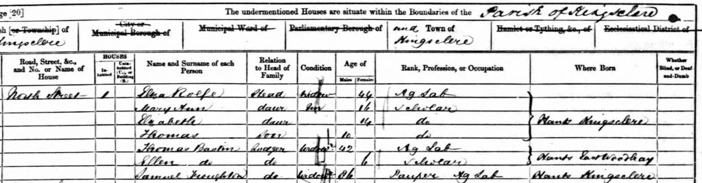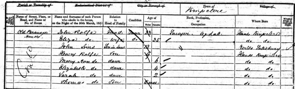 Eliza remarried in 1841 (seems to be a very busy year for the two sisters!). She married a man named John Rolfe, the same man who was a witness to her first wedding. Together, they had 5 children; Henry, Mary Ann, Elizabeth, Sarah Ann and Thomas. Here are the family, including John Sims, living together in Kingsclere in the 1851 census: