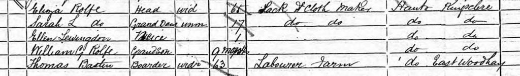 As you can see, the household has filled up a bit. Quite the variety of people too! Let me talk you through each person. The easiest to explain is Thomas Bastin, the same boarder from 1861. We then have Sarah L Rolfe aged 17, of course this is Sarah Louisa. Finally noted as Eliza’s Granddaughter on the record. We have William G Rolfe, aged 9 months. He is Eliza’s Great-Grandson. As you have probably guessed, William was Sarah’s son. I do not know who his father is. However, shortly after this, Sarah got married to a man named George Holley who took in William as his own. The pair had 12 children together!