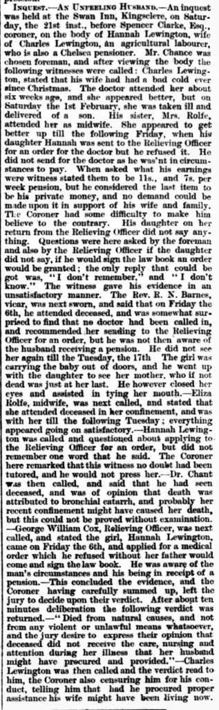 This newspaper article talks about an inquest into Hannah’s passing, which they rules to be down to natural causes, but also add that it could have been prevented if her husband, Charles, had paid for the doctor. This newspaper article also tells me something very interesting, that I didn’t know before. It states that Hannah’s midwife was her sister-in-law, Eliza Rolfe.